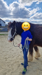 Er geht mit Begeisterung reiten und liebt den Kontakt zum Pferd.